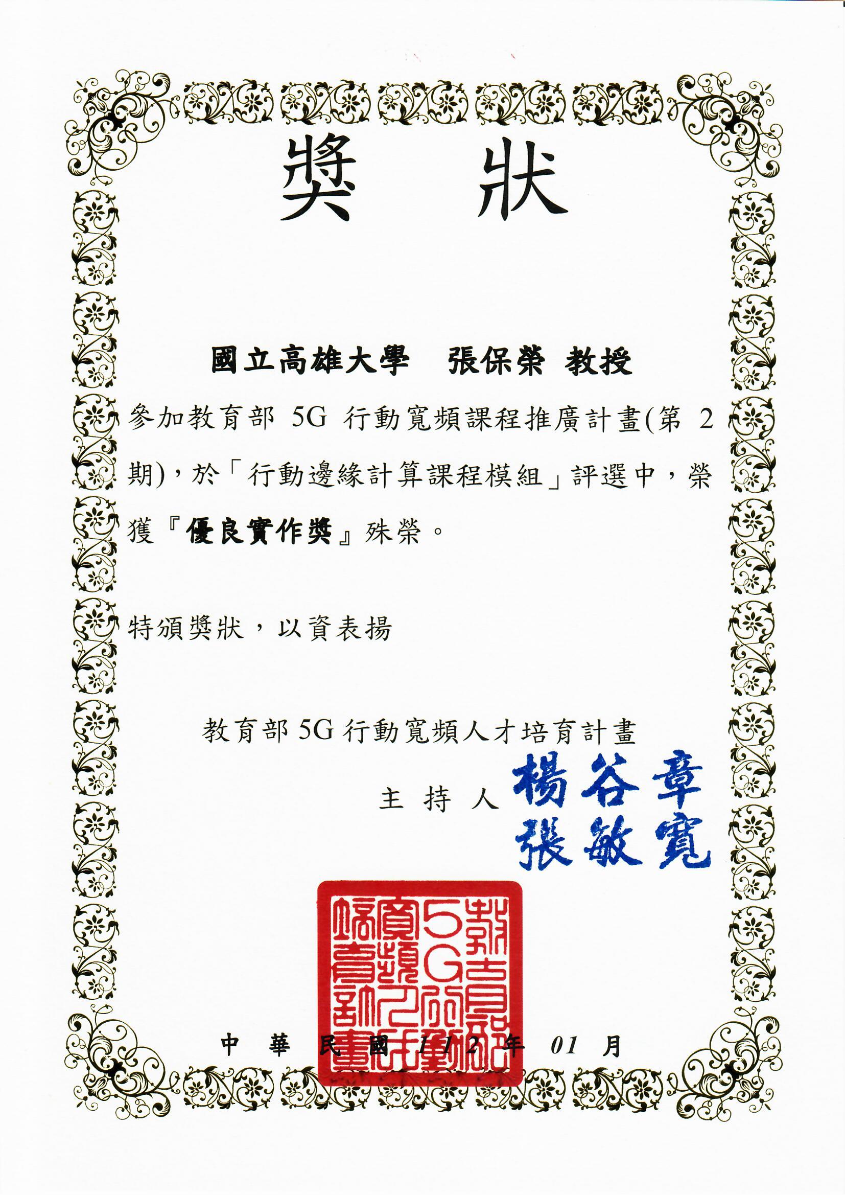 【獲獎】 恭賀張保榮教授榮獲教育部111年5G行動寬頻課程推廣計畫(第2期)「行動邊緣計算課程模組-優良實作獎」
