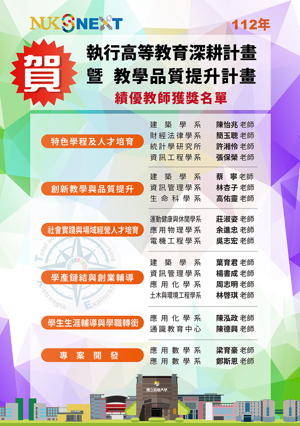 榮獲本校112年度「執行高等教育深耕計畫暨教學品質提升計畫」的「特色學程及人才培育」類別績優教師奬勵!!